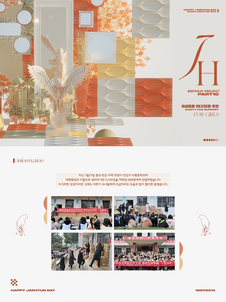 지난 1월27일 재현바는 재현 생일 프로젝트의 일환으로 중국 빈곤 지역 쯔양시 안강구 우황중학교에 재현팬덤의 이름으로 생리대 𝟵𝟲𝟯𝟮𝟬장을 여학생 𝟲𝟴𝟴명에게 전달하였습니다.