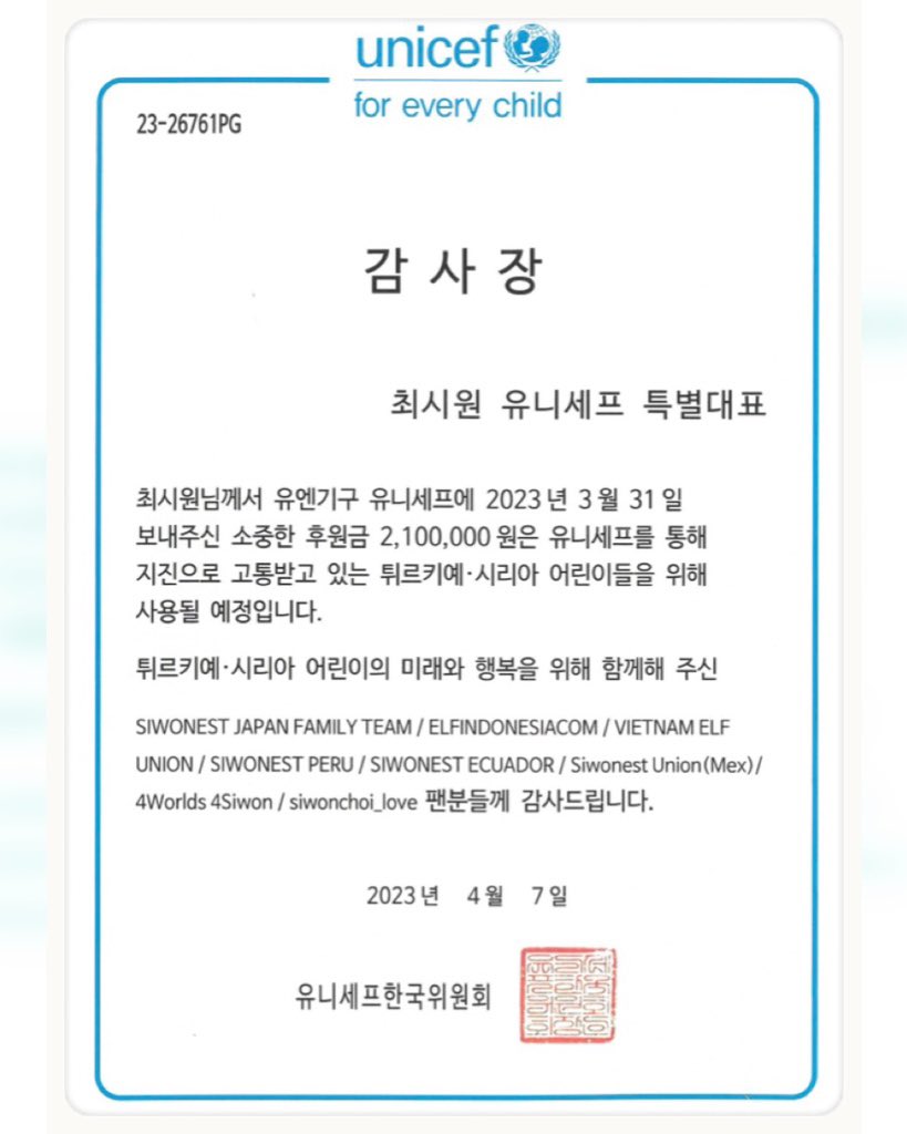 A Spring of Hope SUPPORT 1: UNICEF KOREA Donation トルコシリア緊急支援に参加しました 参加の皆様ありがとうございました Unicef Korea Turkey and Syria Emergency Relief joined Thank you to all who participated 💙 @siwonchoi #siwon #HappySiwonDay
