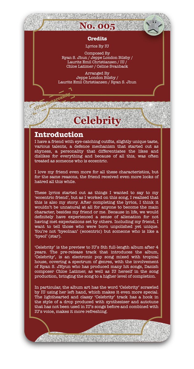 “Here is a greeting from a glamorous yet slightly lonely IU, to show her gratitude to everyone who has read the first page of her 20s to the last page.”