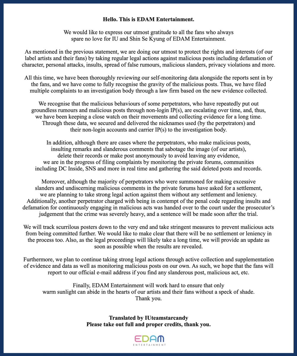 @edam_ent @_IUofficial [TRANS] 220121 #IU’s agency, EDAM Entertainment shares latest update on legal action against malicious posts