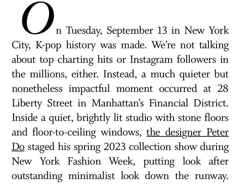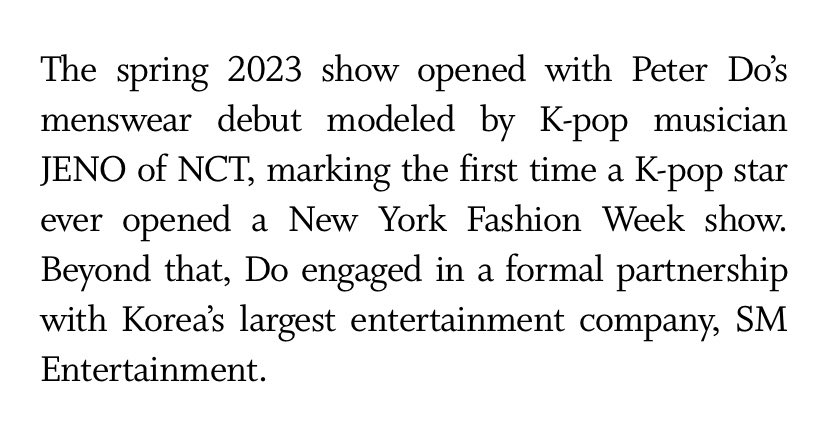 “The spring 2023 show opened with Peter Do’s menswear debut modeled by K-pop musician #JENO of NCT, marking the first time a K-pop star ever opened a New York Fashion Week show.“