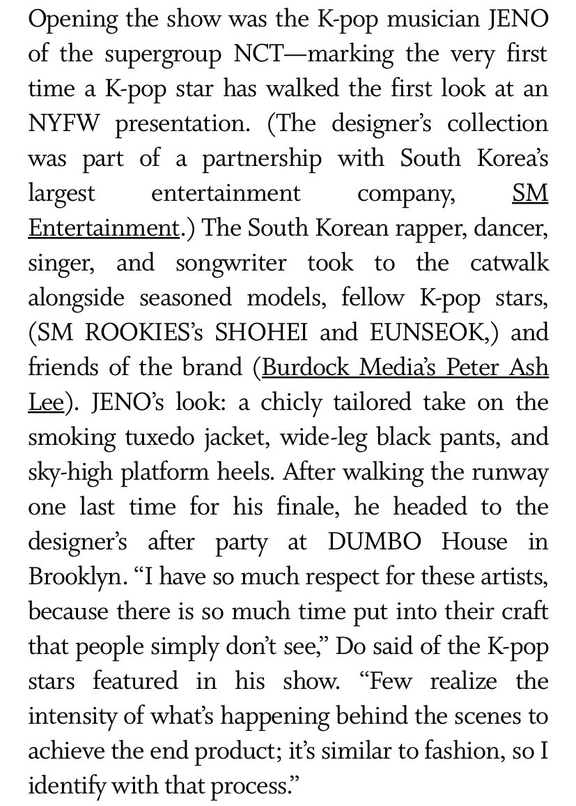 “Opening the show was the K-pop musician JENO of the supergroup NCT—marking the very first time a K-pop star has walked the first look at an NYFW presentation.”
