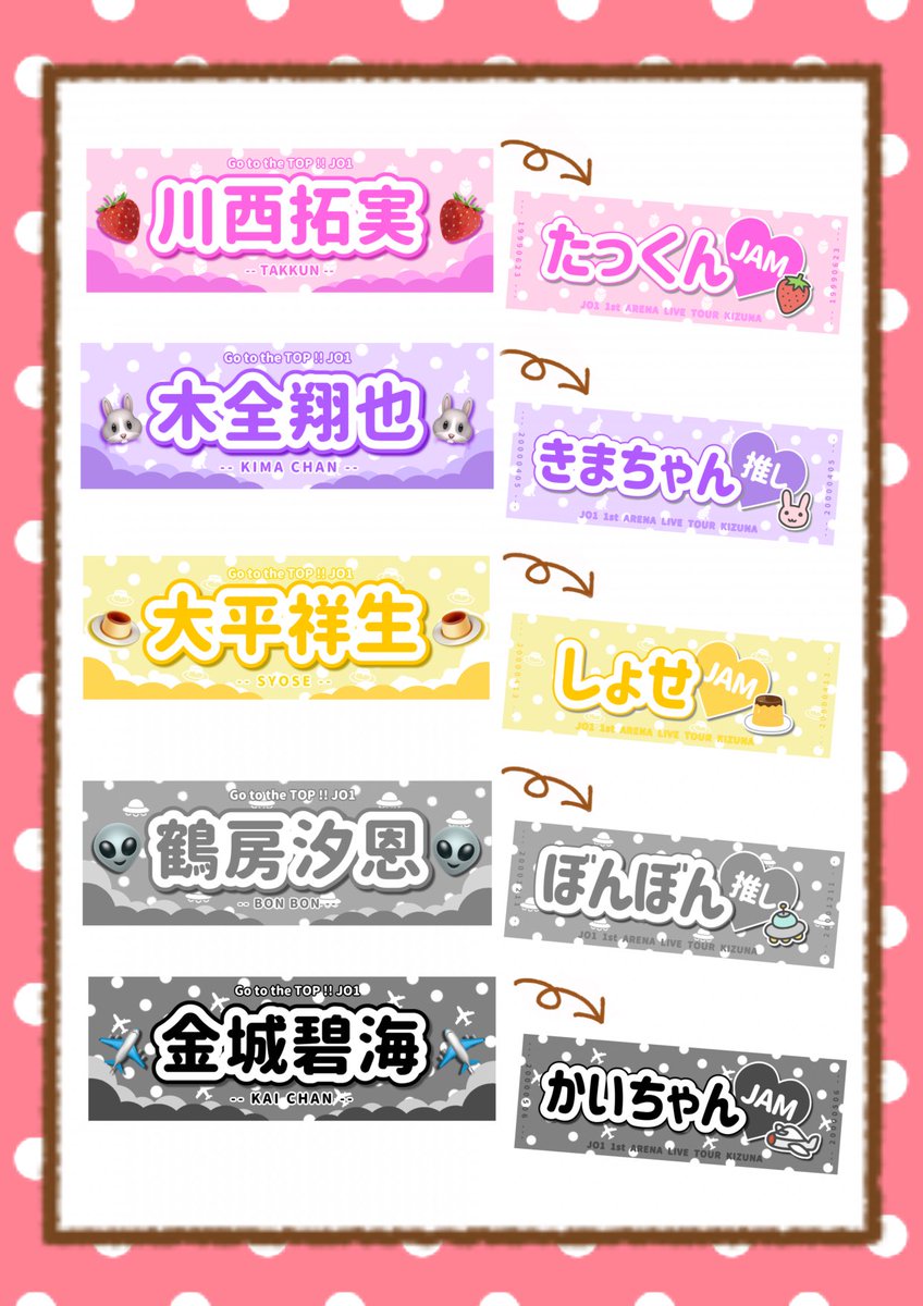 🏷 JO1スローガン配布 沢山のご要望ありがとうございました( ; ; ) 応援規定を遵守した上で再度作成致しましたので、もし良ければご利用ください🙇️(画像4枚目参照) 今回も条件無しでご自由にお使いください🤲🏻 原画はリプ欄より保存可能(印刷時要サイズ調整) #JO1スローガン #JO1_ARENA_TOUR