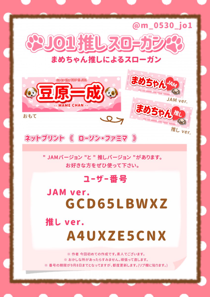 どこに需要あんねんって感じですが、語彙力のないオタクのスローガン作りました。 ネットプリント登録したのでよかったらどうぞ〜! ファミマ・ローソン ユーザー番号:6ZRWEYWMR7 #JO1配布 #JO1_ARENA_TOUR #JO1スローガン