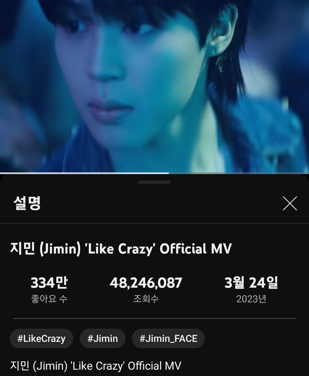 지민의 "Like Crazy" Official MV가 유튜브에서 조회수 4800만뷰를 돌파했습니다.
