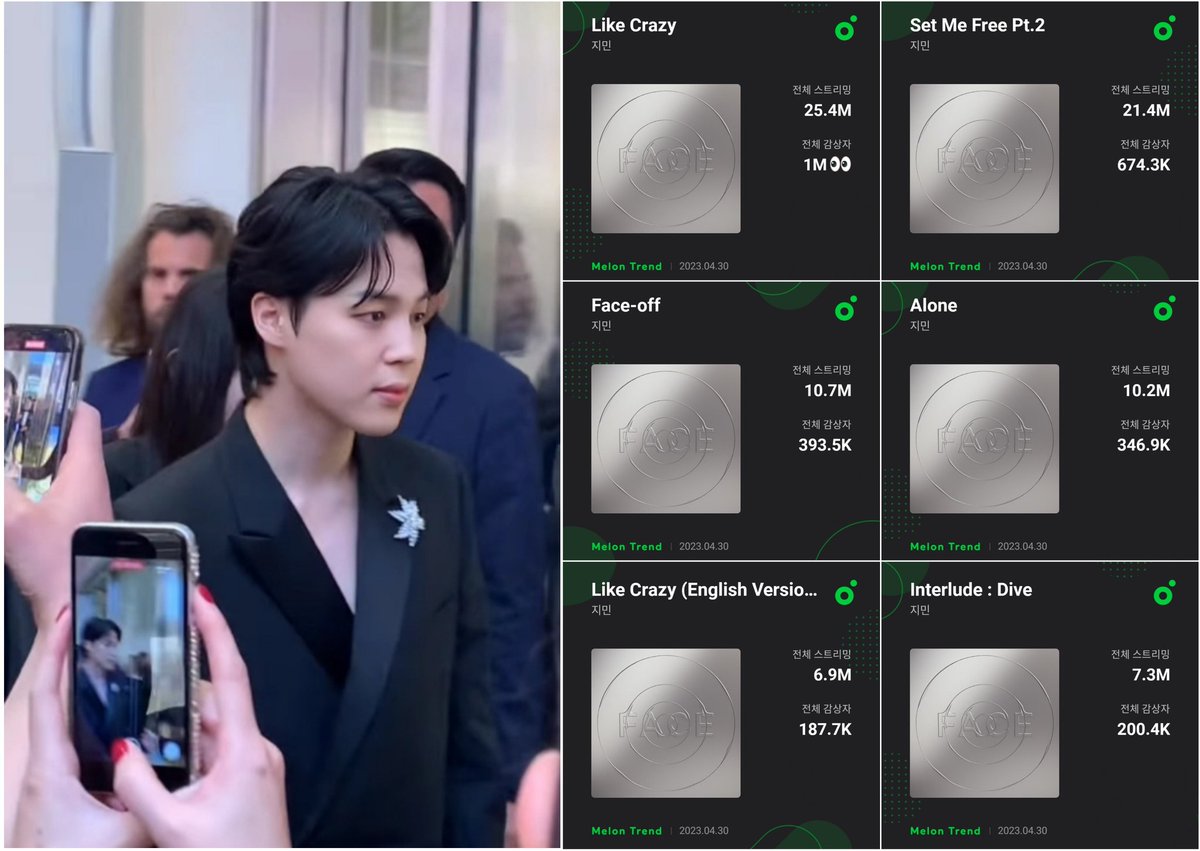 지민의 첫 솔로앨범 "FACE"의 수록곡 "Alone"이 MELON에서 1000만 스트리밍을 돌파하였습니다.