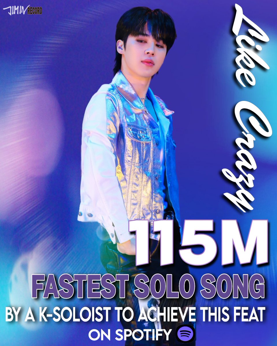 지민의 타이틀곡 "Like Crazy"가 Spotify에서 1억 1500만 스트리밍을 37일만에 돌파하였습니다.