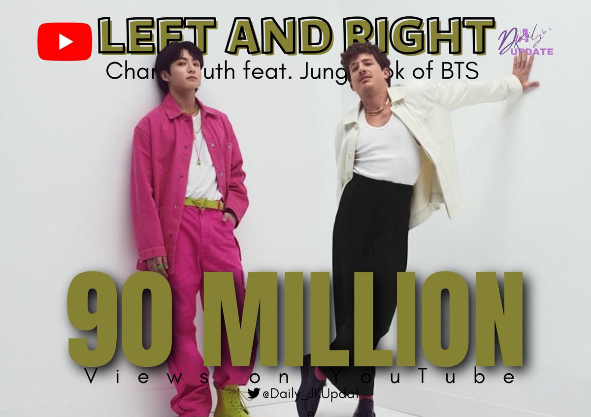 📊 “Left and Right” by Charlie Puth and Jungkook Official Music Video surpassed 90 Million streams on YouTube✨