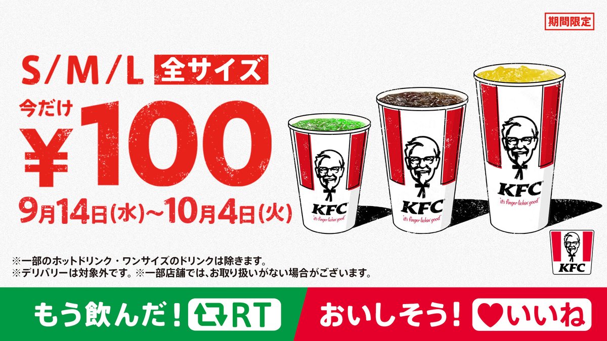 10月4日(火)まで #ケンタ のドリンクS・M・L全サイズが【100円】で楽しめる🌟