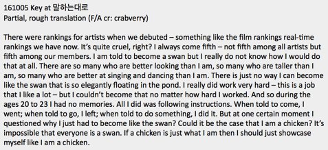 161005 #Key on 말하는대로 rough, partial translation (F/A cr. crabverry) - Please inform if inappropriate/wish for trans to be taken down. ^^