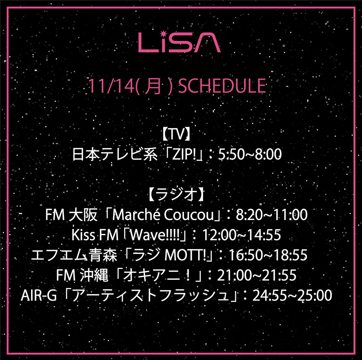 明日11/14(月)5:50-8:00放送の日本テレビ系「ZIP!」にてLiSAがインタビュー出演いたします。いよいよリリースのニューアルバム「LANDER」についてたくさんお話させて頂きました。是非お見逃しなく!