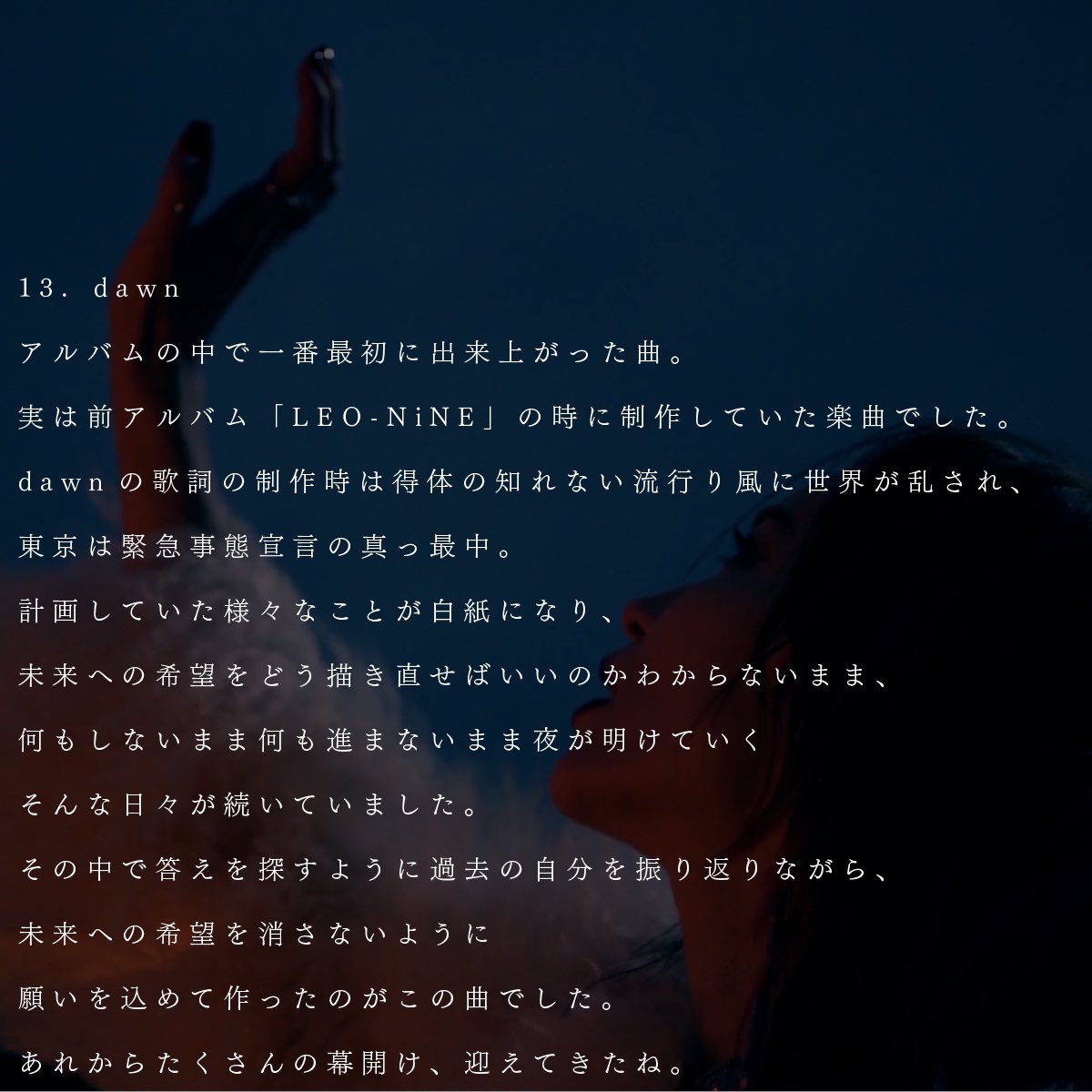 dawnの歌詞の制作時、東京は緊急事態宣言の真っ最中。計画していた様々なことが白紙になり、未来への希望をどう描き直せばいいのかわからないまま、何もしないまま何も進まないまま夜が明けていくそんな日々が続いていました。あれからたくさんの幕開け、迎えてきたね。