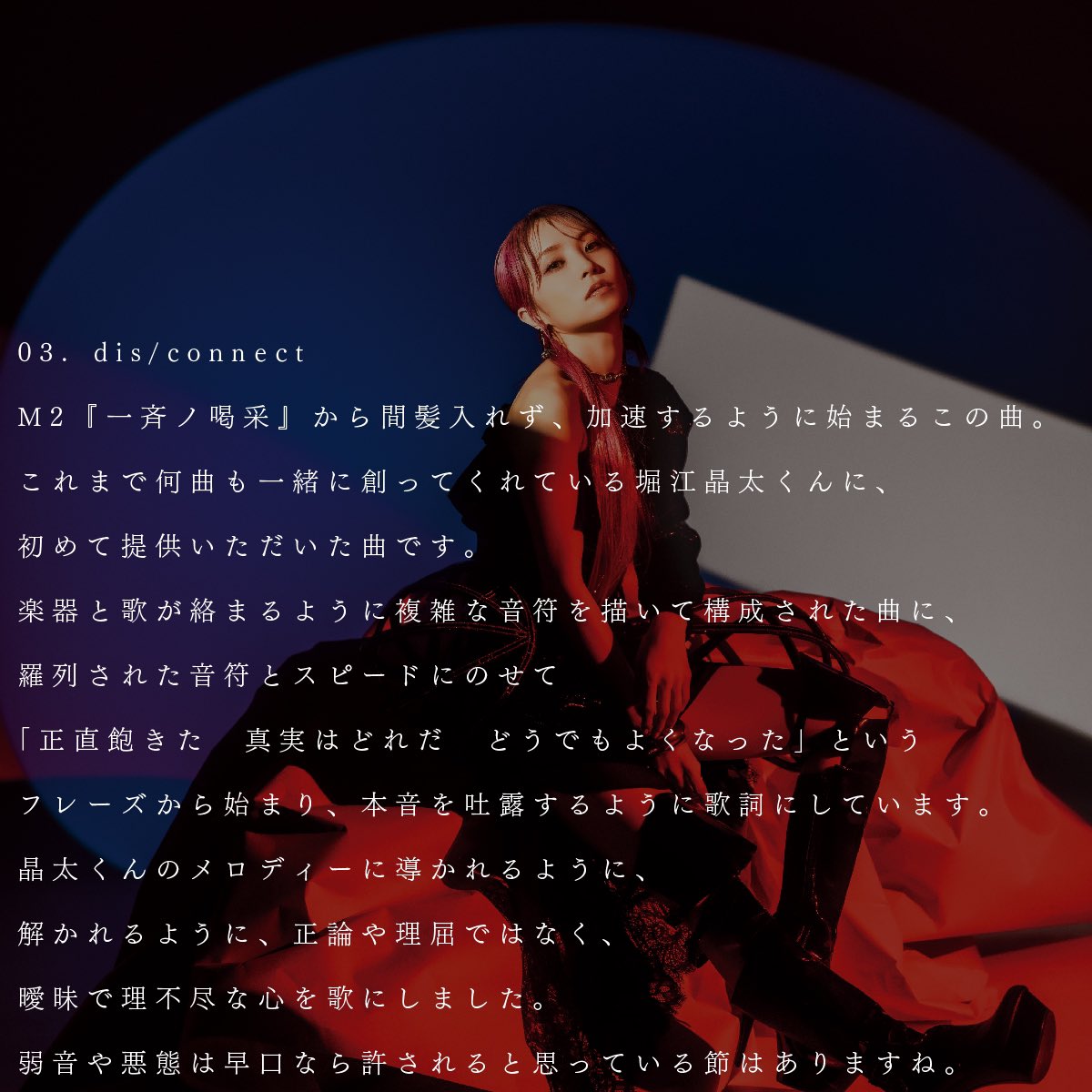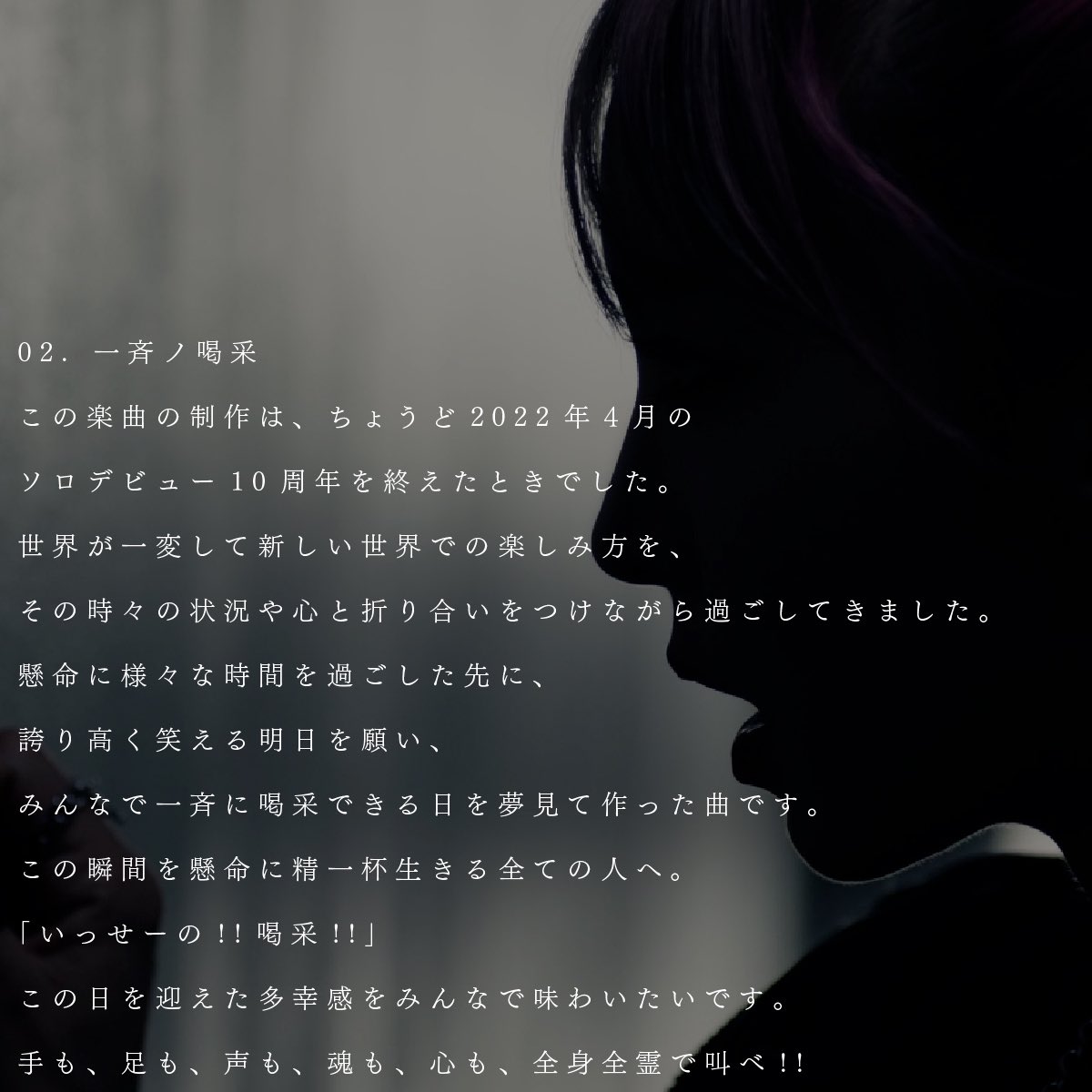 懸命に様々な時間を過ごした先に、誇り高く笑える明日を願い、みんなで一斉に喝采できる日を夢見て作った曲です。