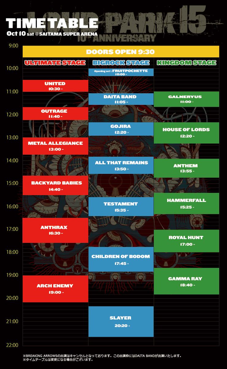 GAMMA RAY、ARCH ENEMY に続き、いよいよ本日の大トリ、帝王SLAYERがまもなく降臨!!