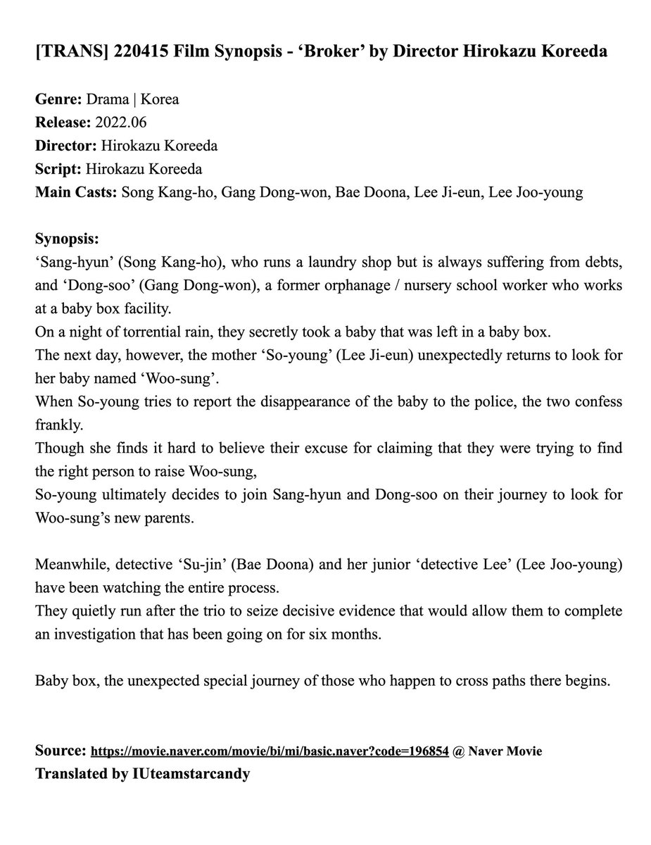 [TRANS] 220415 Film Synopsis - #Broker by Director Hirokazu Koreeda