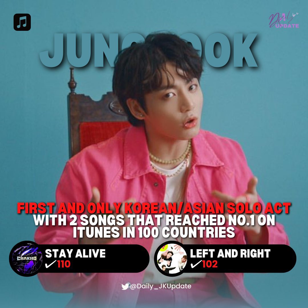 JUNGKOOK is the First and Only Korean/Asian Solo Act With 2 Songs That Reached No.1 on iTunes in 100 Countries.