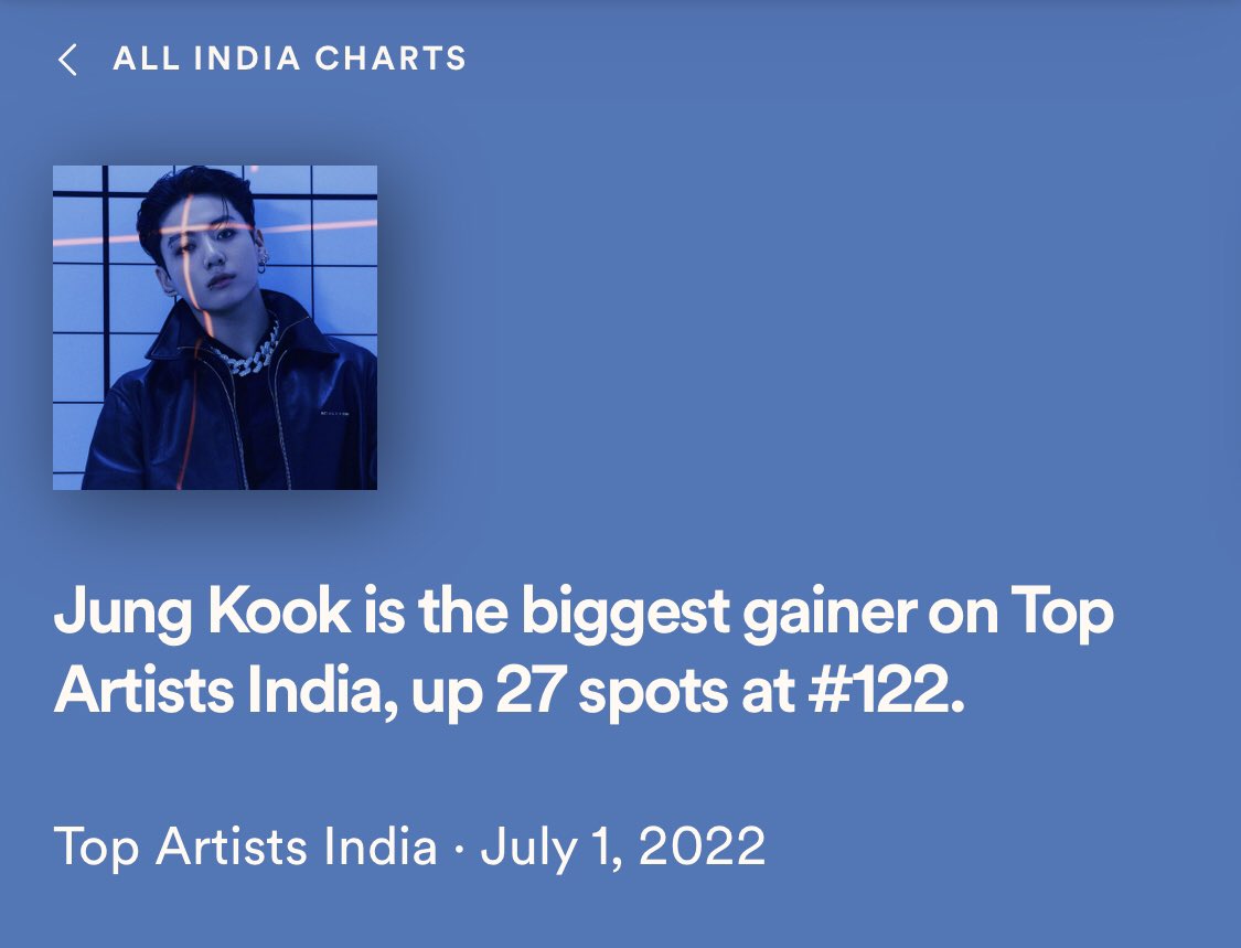 📊 Jung Kook is the biggest gainer on Spotify India Top Artists Daily Chart, up 27 spots at new peak #122.✨