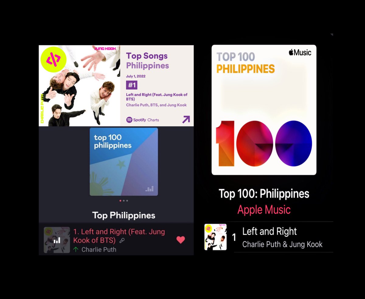 📊 “Left and Right” by Charlie Puth Feat. Jungkook of BTS spends it’s 8th day at #1 (+1) on PHILIPPINES Daily Charts with 412,007 filtered streams ✨