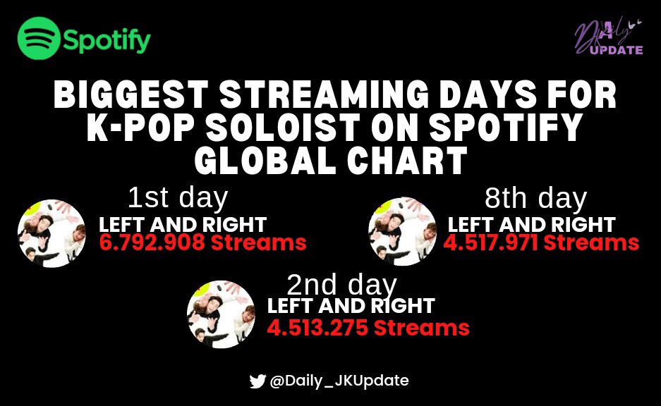 📊 Jungkook earned the Top 3 Biggest Streaming Days By A K-Pop Soloist On Spotify Global History: