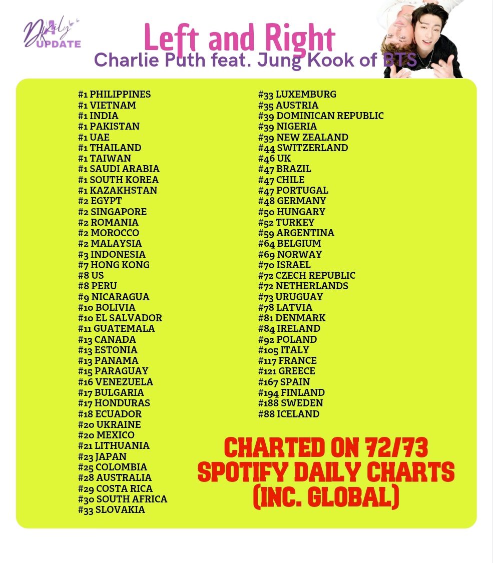 📊 “Left and Right” by Charlie Puth Feat. Jungkook of BTS has already charted on 72 out of 73 Spotify Daily Charts except Belarus.✨