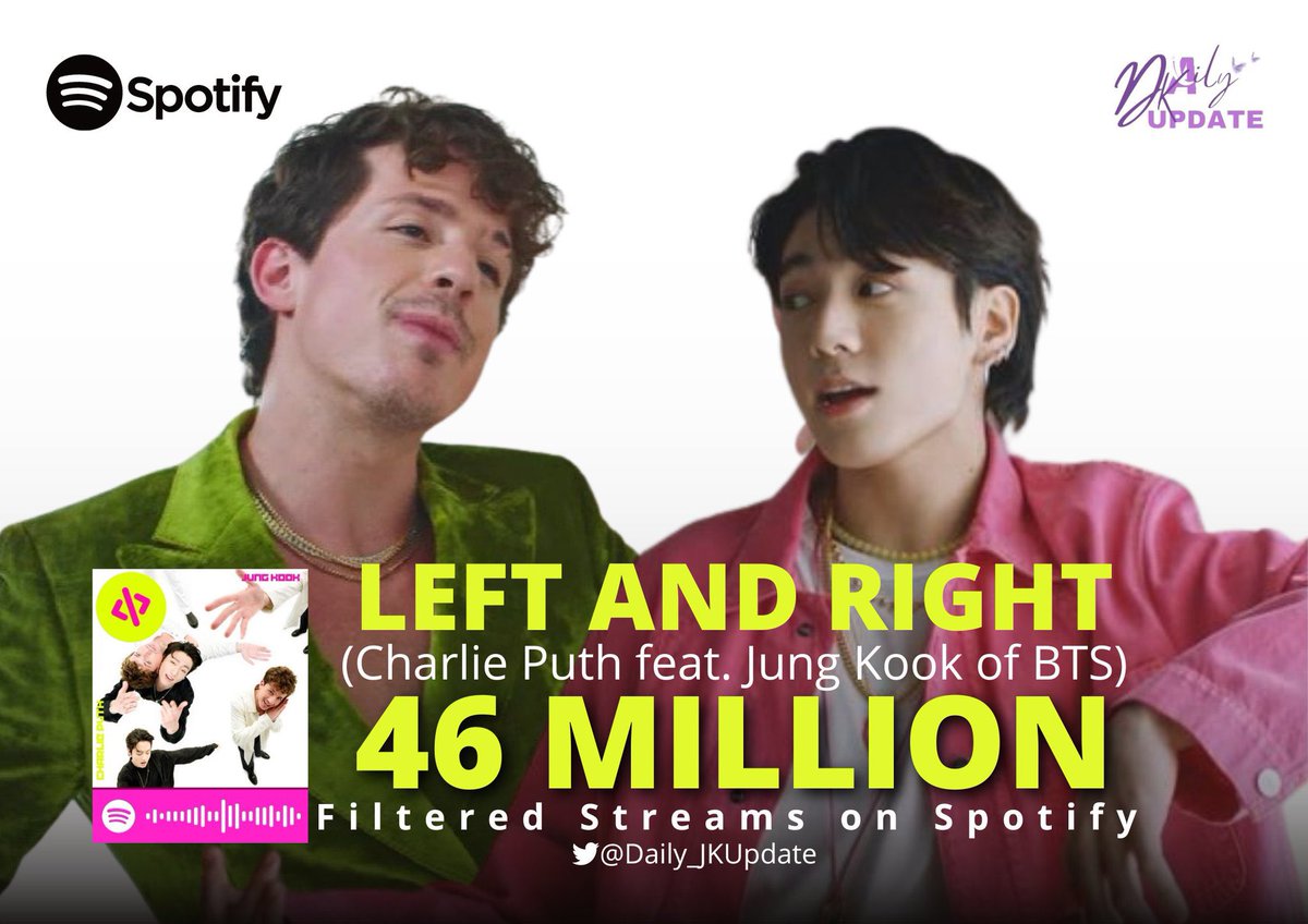 📊 “Left and Right” by Charlie Puth and Jungkook of BTS spends its 11th day at #27 (-6) on Spotify USA Daily Chart with 519,930 filtered streams.