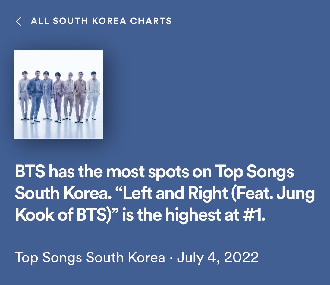 BTS has the most spots on Spotify Top Songs South Korea. “Left And Right (feat Jungkook of BTS)” is the highest at #1.