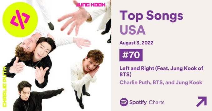 📊 “Left and Right” by @charlieputh and Jungkook spends its 42nd day at #73 (-3) on Spotify USA Daily Chart with 337,144 filtered streams.