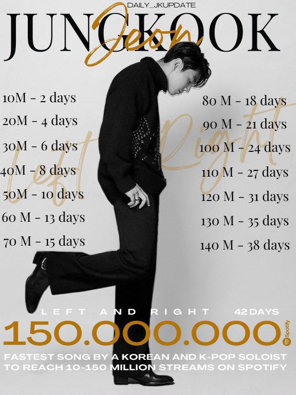 📊 JUNGKOOK is the Fastest Korean and Kpop Solo Act to reach 10M ,20M, 30M, 40M, 50M, 60M, 70M, 80M, 90M, 100M, 110M, 120M, 130M, 140M, and 150M streams on Spotify with #LeftandRight ✨