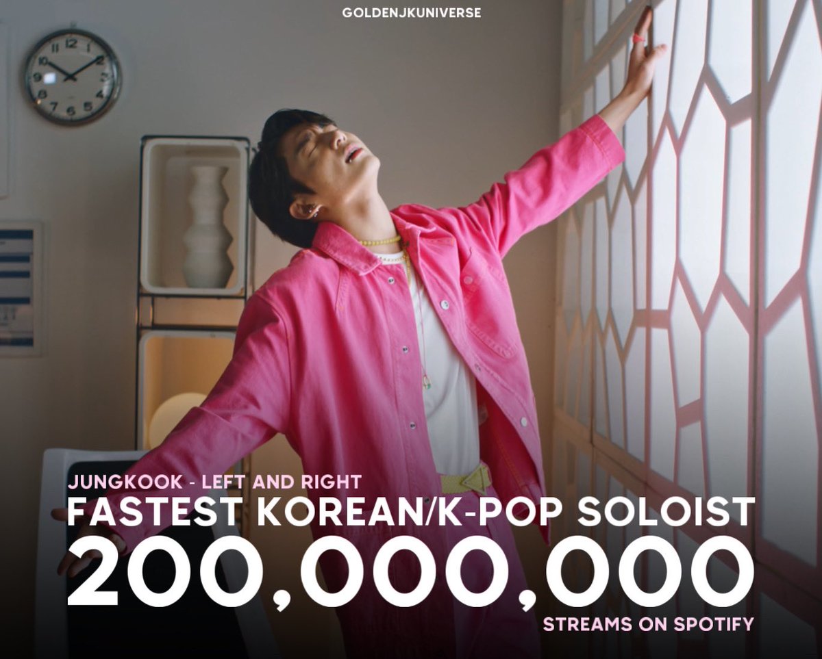 NEW RECORD — ‘Left and Right’ has now surpassed 200M streams on Spotify in just 61 days making #Jungkook the fastest K-pop/Korean soloist to achieve this milestone! 🥳🔥