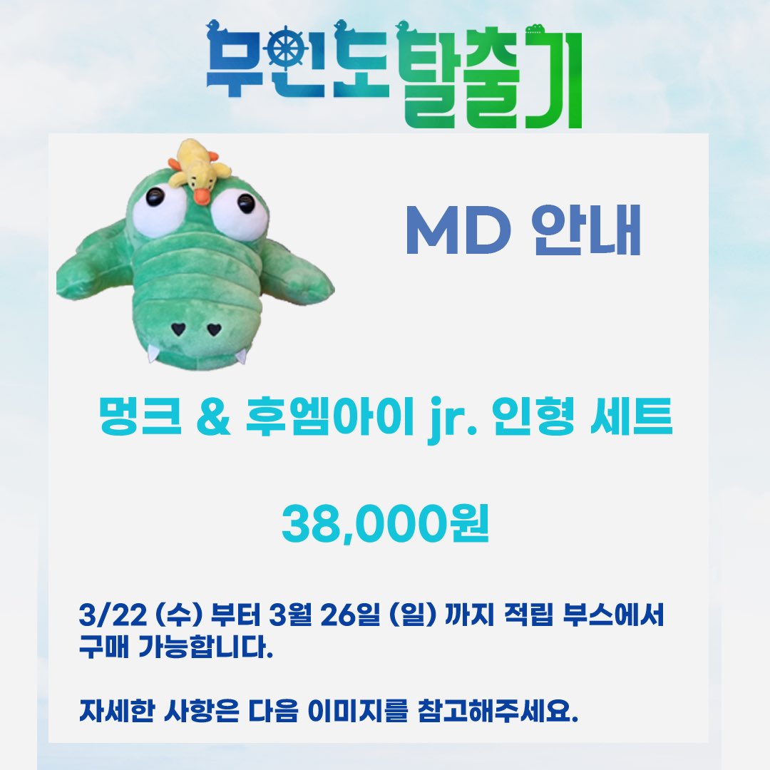 대학로 악어떼 출몰 사건의 바로 그 주인공! 멍크&후엠아이 jr. 인형 세트 38,000원 1인 2개 구매 제한 2021년 뮤지컬 <무인도 탈출기> , 2023년 연극 <무인도 탈출기>의 티켓을 소지하고 계신 분에 한해 MD 구매가 가능합니다. 구매시 티켓을 함께 제시해주세요.