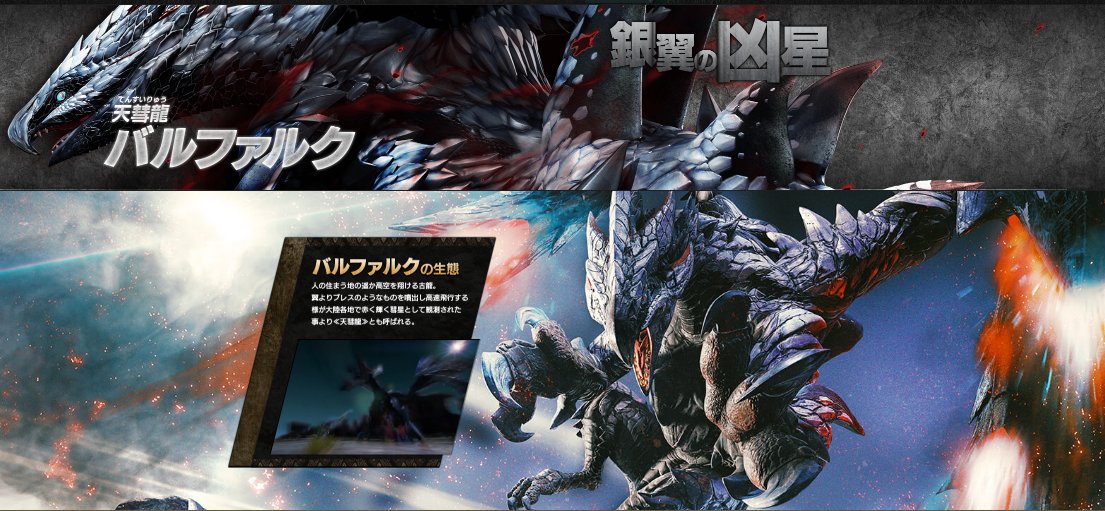 わたし、カティより新メインモンスター「天彗龍 バルファルク」の情報です・・!なにやら『「天彗龍 バルファルク」は翼よりエネルギーを噴出し高速飛行する様が大陸各地で赤く輝く彗星として観測されている。』とのことでしたよ~。 #MHXX