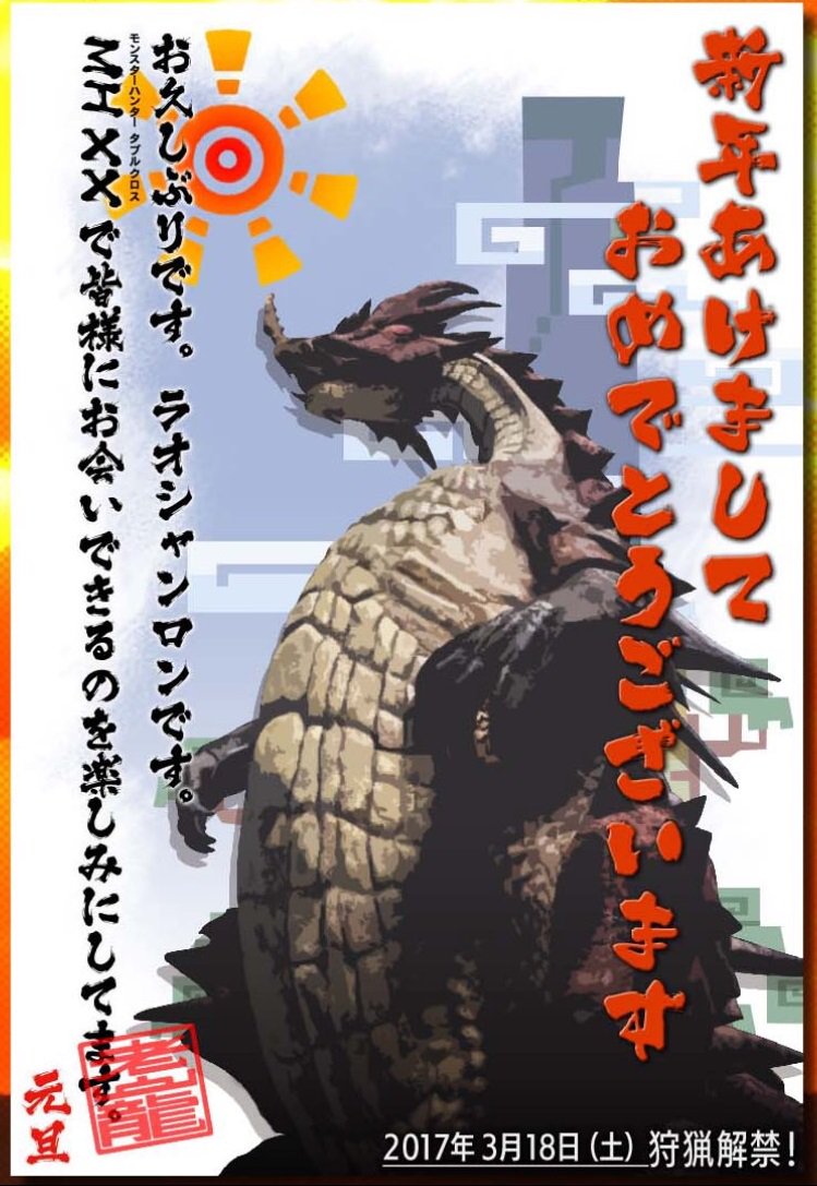 ハンターさん~!明けましておめでとうございます!3月18日狩猟解禁のMHXX(モンスターハンターダブルクロス)でラオシャンロンが登場するんですって・・!新映像 youtube.com/watch?v=iJAaJH… #MHXX