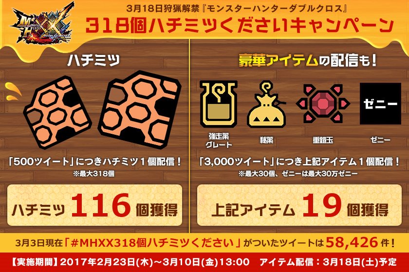 『モンスターハンターダブルクロス』 #MHXX318個ハチミツください 企画!現在81,000ツイートを突破しています!企画終了まであと3日です~!RTでも参加できますよ~!bit.ly/2memcqG