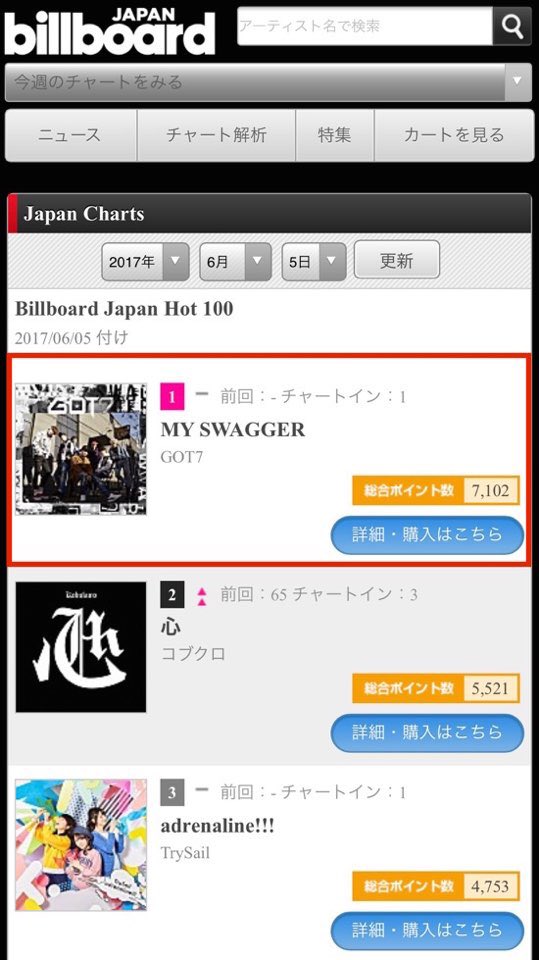 GOT7 4th SG「MY SWAGGER」がビルボード 総合チャートBillboard JAPAN Hot100 (6月5日付)においても1位を獲得しました!ありがとうございます♡