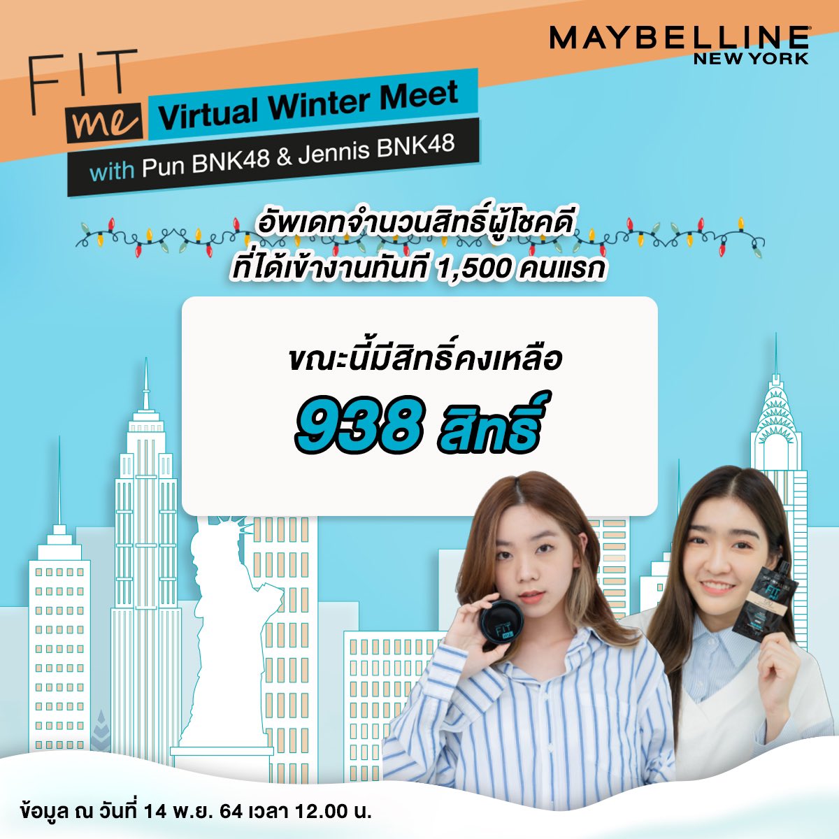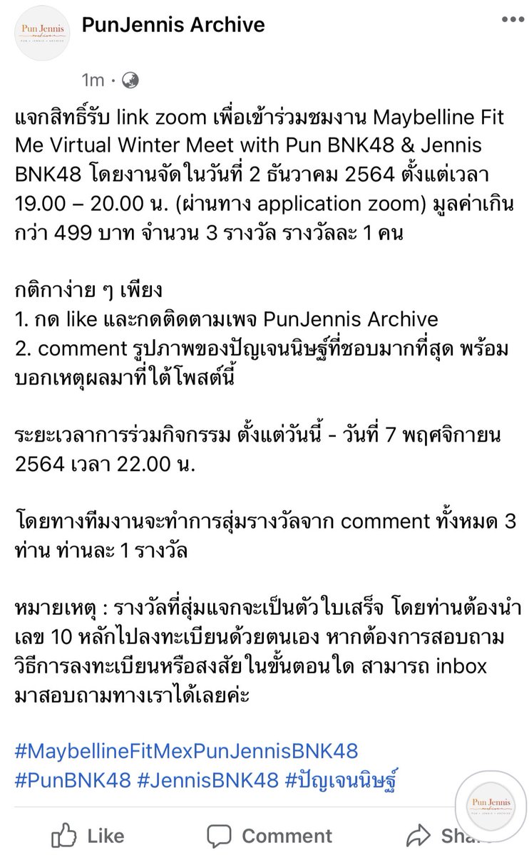 แจกสิทธิ์รับ link zoom เพื่อเข้าร่วมชมงาน Maybelline Fit Me Virtual Winter Meet with Pun BNK48 & Jennis BNK48 ทาง Facebook : PunJennis Archive
