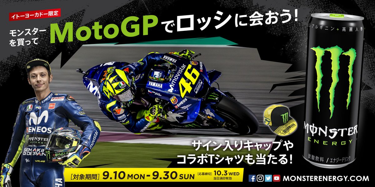 今週末は遂に #MotoGP 日本グランプリ!#MonsterEnergy 製品を2本購入したレシートを会場に持参すると、ロッシサイン入りグッズが当たるキャンペーンを開催!ゲットしてロッシ@ValeYellow46 を応援しよう!#JapaneseJP #VR46