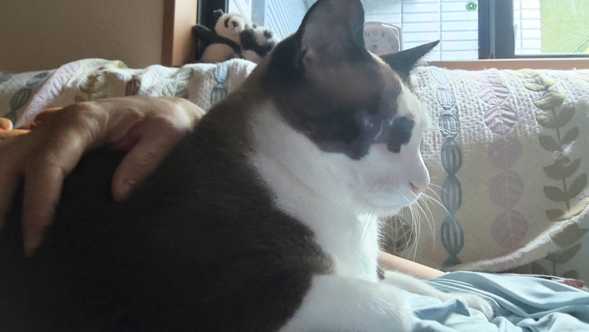 執事の足にお尻をくっつけてくつろいでいた福本兄さん、やってきたちびすけを優しく毛繕いしてやった挙げ句、ソファーから落とされるの巻。