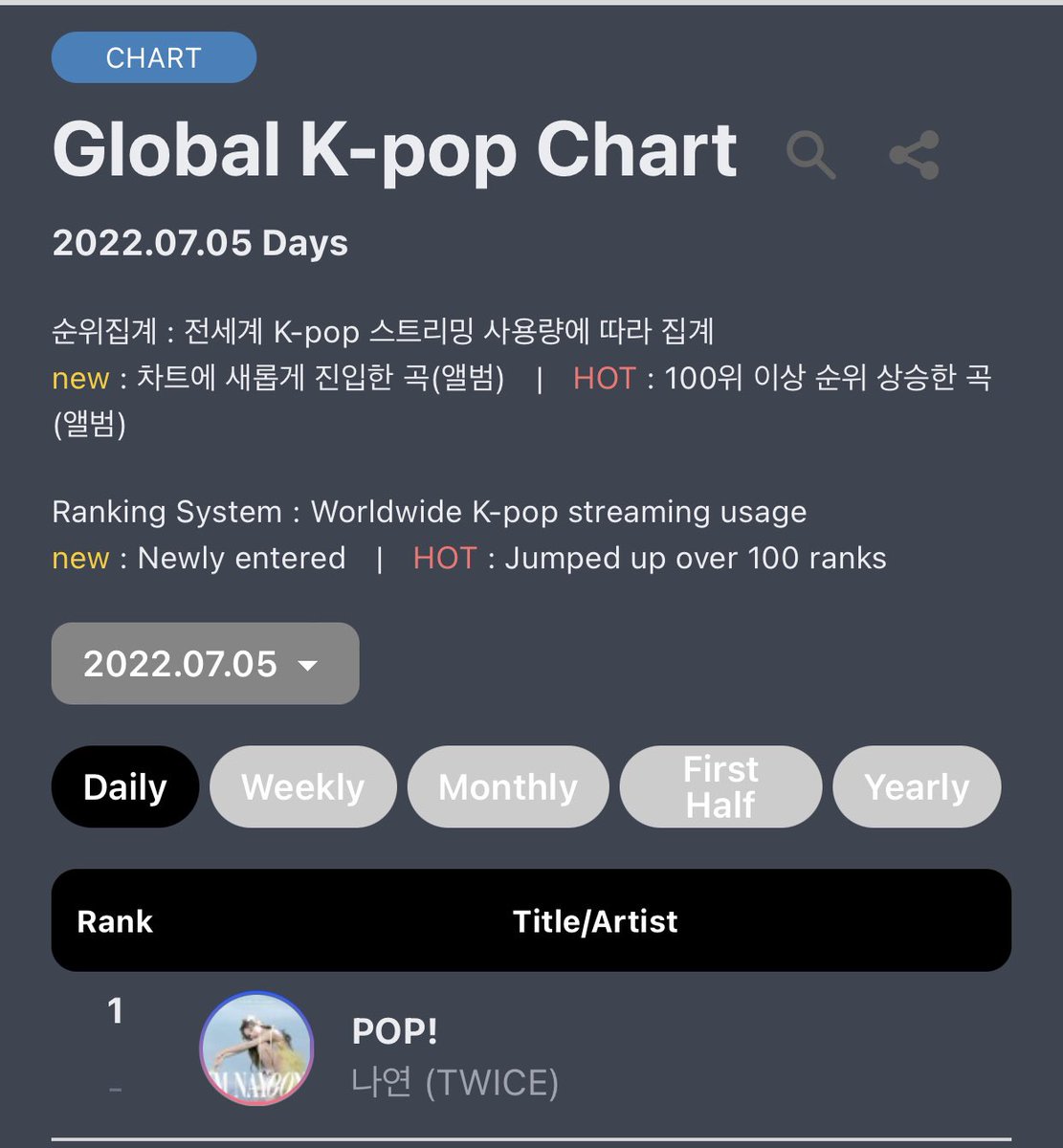 #NAYEON’s "POP!" has reached a new peak of #1 on Circle Global K-pop Chart! She also spent 2 consecutive days at the top. 💫