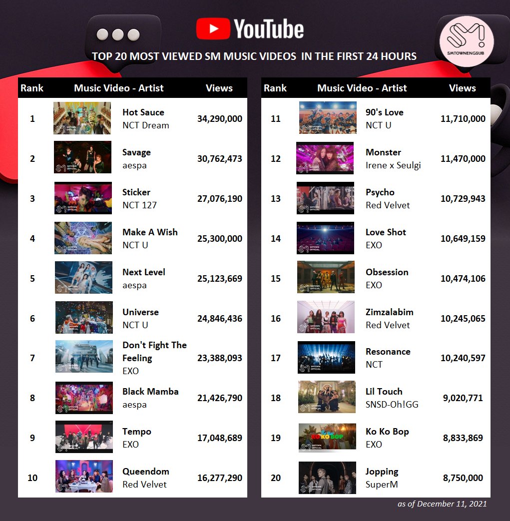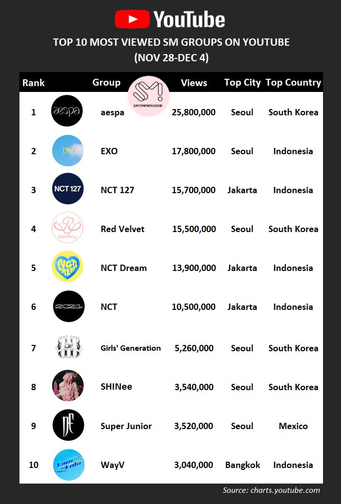 Top 10 Most Viewed SM Groups on YouTube (Nov.28-Dec.4)