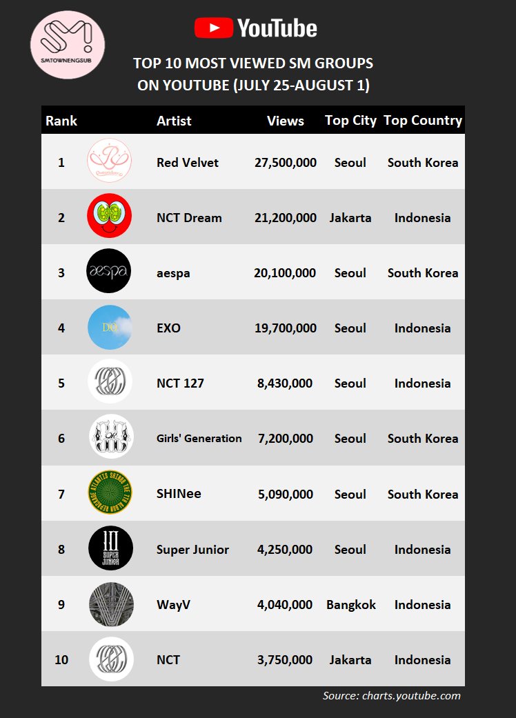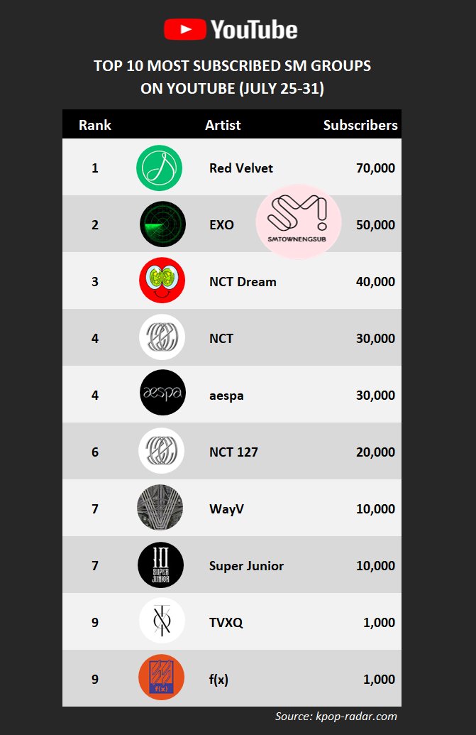 Top 10 Most Subscribed SM Groups on YouTube (July 25-31)