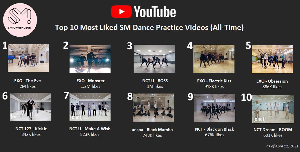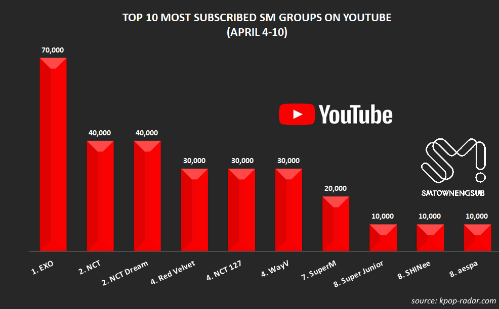 Top 10 Most Subscribed SM Groups on YouTube (Apr.4-10)