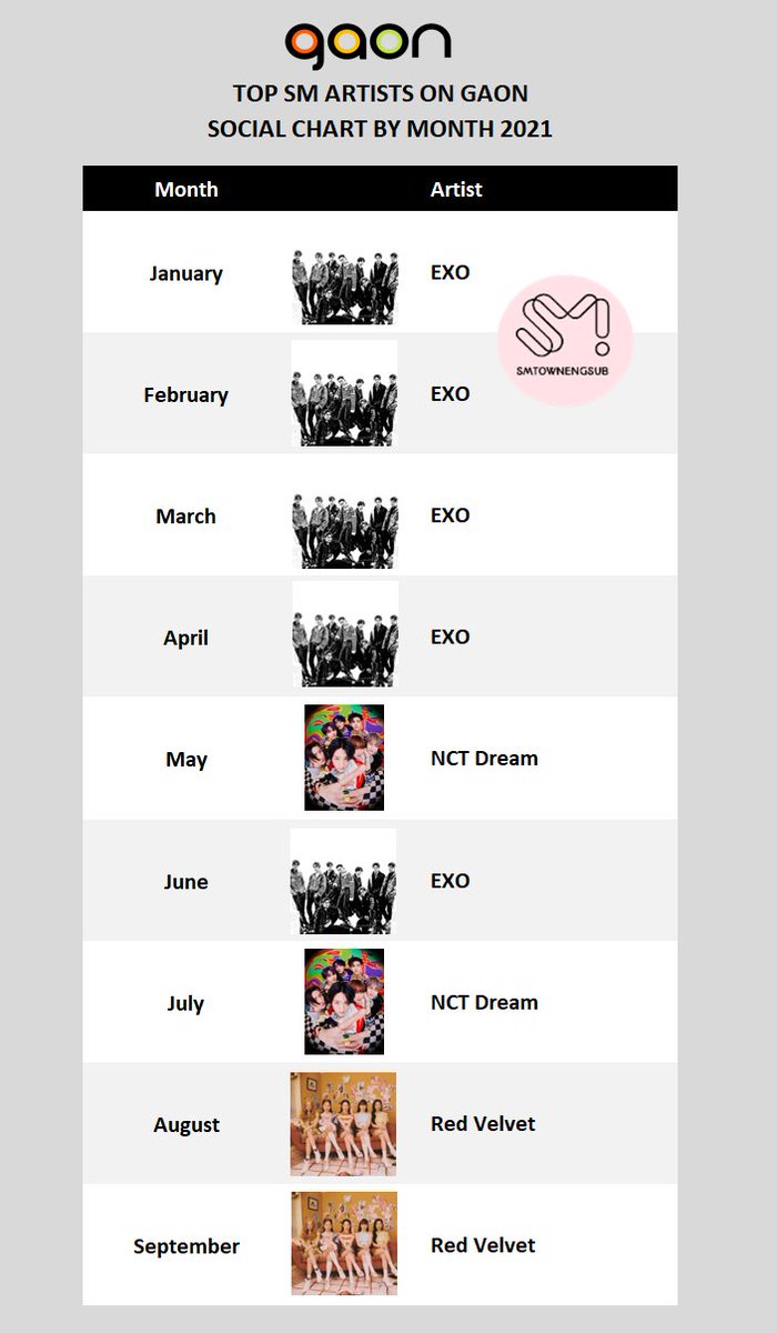 Top SM Artists on Gaon Social Chart by month 2021: