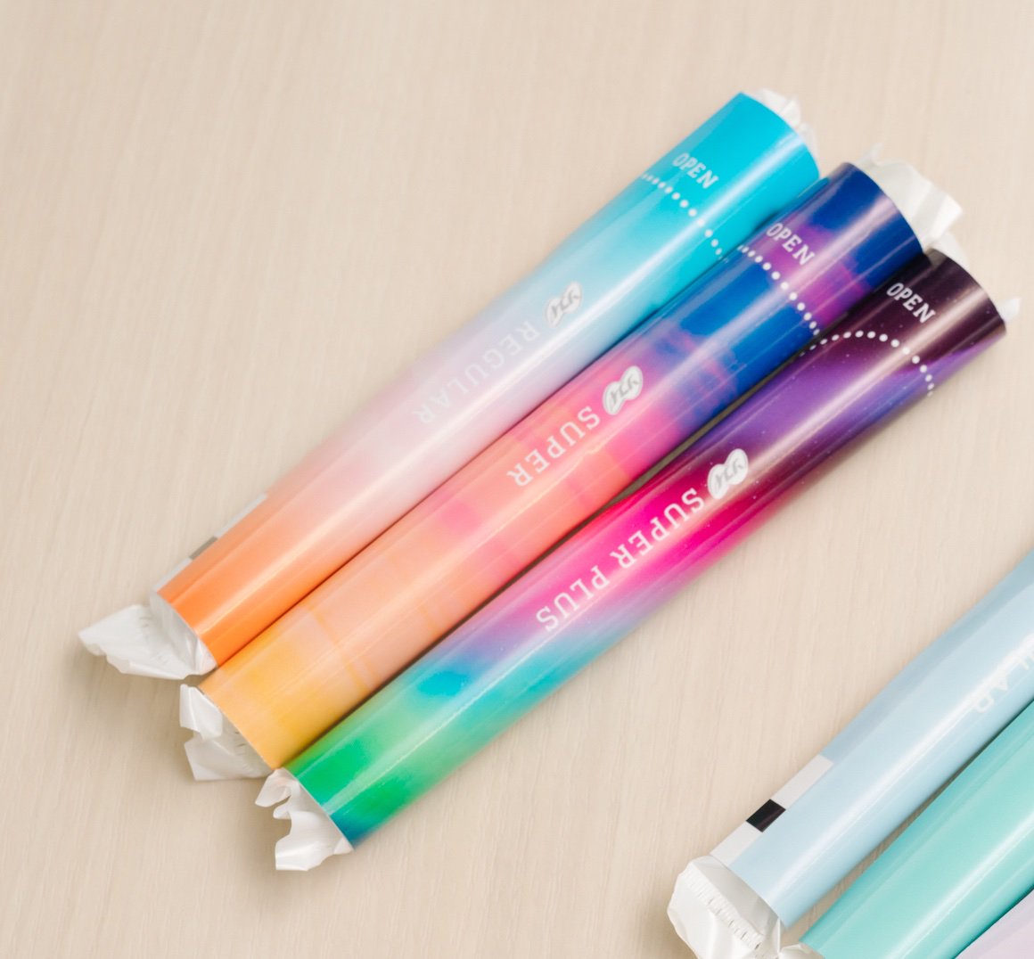 普通の日用の「レギュラー」は朝焼けの空の色。多い日用の「スーパー」は夕焼けを。特に多い日用の「スーパープラス」は、オーロラを表しています。うつろいやすい生理期間中の体調を、変わり続ける空の色に託して生まれました。