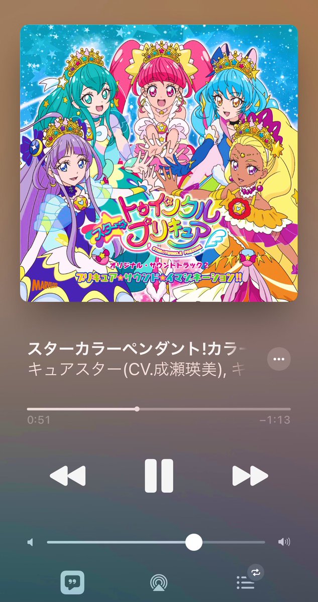 #Nowplaying スターカラーペンダント!カラーチャージ!(クインテット・ヴァージョン) - キュアスター(CV.成瀬瑛美), キュアミルキー(CV.小原好美), キュアソレイユ(CV.安野希世乃), キュアセレーネ(CV.小松未可子), キュアコスモ(CV.上坂すみれ)