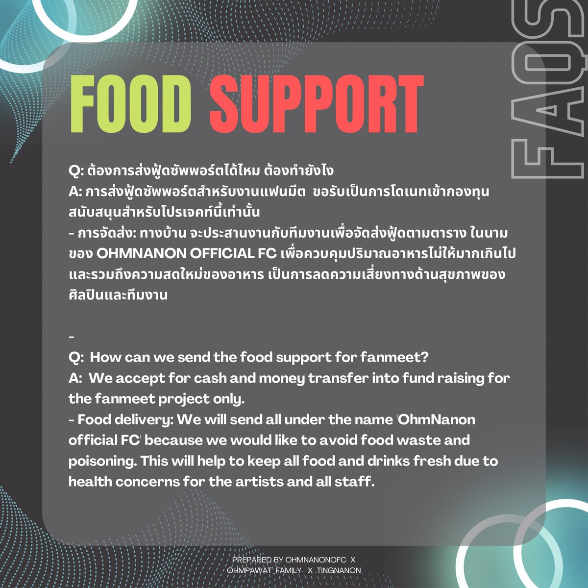 📣ประกาศ: รายละเอียดเกี่ยวกับการส่งฟู้ดซัพพอร์ต การมอบของขวัญในวันงาน #OhmNanon1stFM ให้กับน้องๆค่ะ