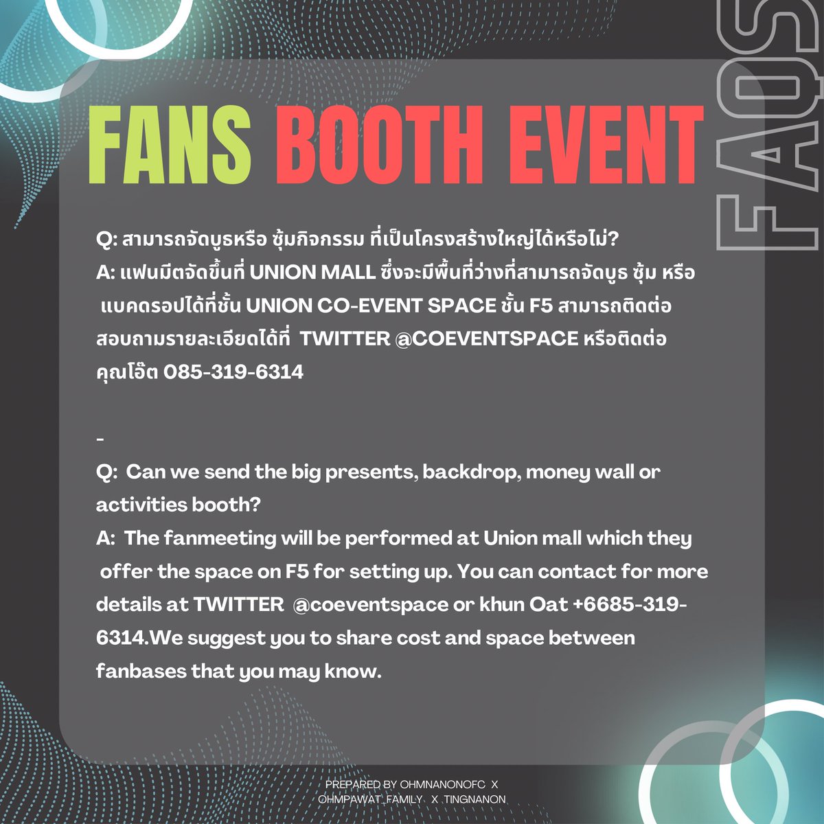 For booth at Union mall, if you can share cost and space with other fanbases, please contact us to match others via DM to join with you.