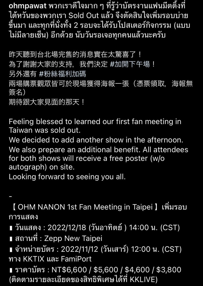 และเพื่อแสดงความขอบคุณสำหรับการสนับสนุนที่มีให้กับโอมและนนน ทุกที่นั่งรับทันทีโปสเตอร์กิจกรรม (ไม่มีลายเซ็น) เปิดจำหน่ายบัตรรอบ 14:00 น. วันเสาร์ที่ 12 พ.ย. 65 เวลา 12:00 น. (CST)
