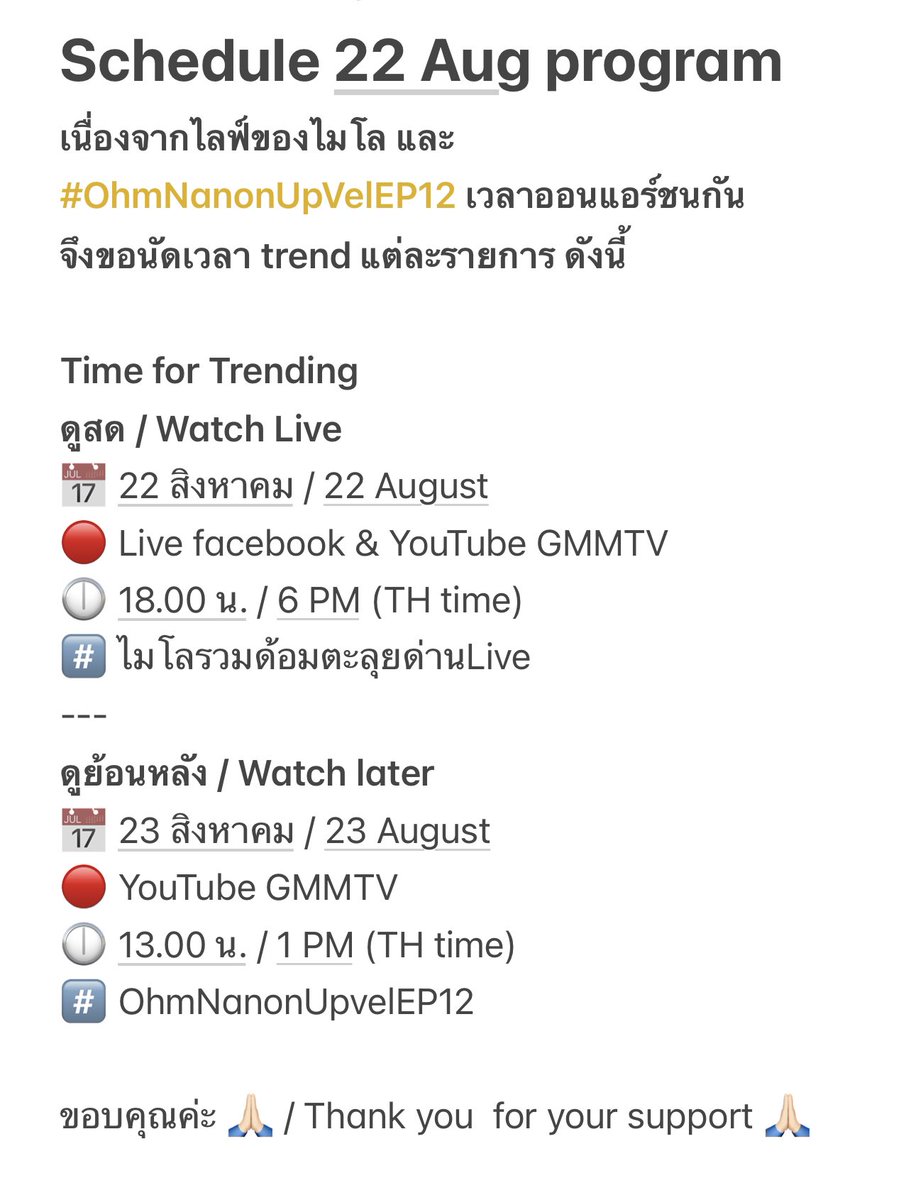 เนื่องจากไลฟ์ของไมโลและ #OhmNanonUpvel ออนเวลาเดียวกัน จึงขอนัดเวลาเทรนด์ใหม่ตามด้านล่างนี้ค่ะ ขอบคุณทุกๆคนมากๆค่ะ 🙏🏻