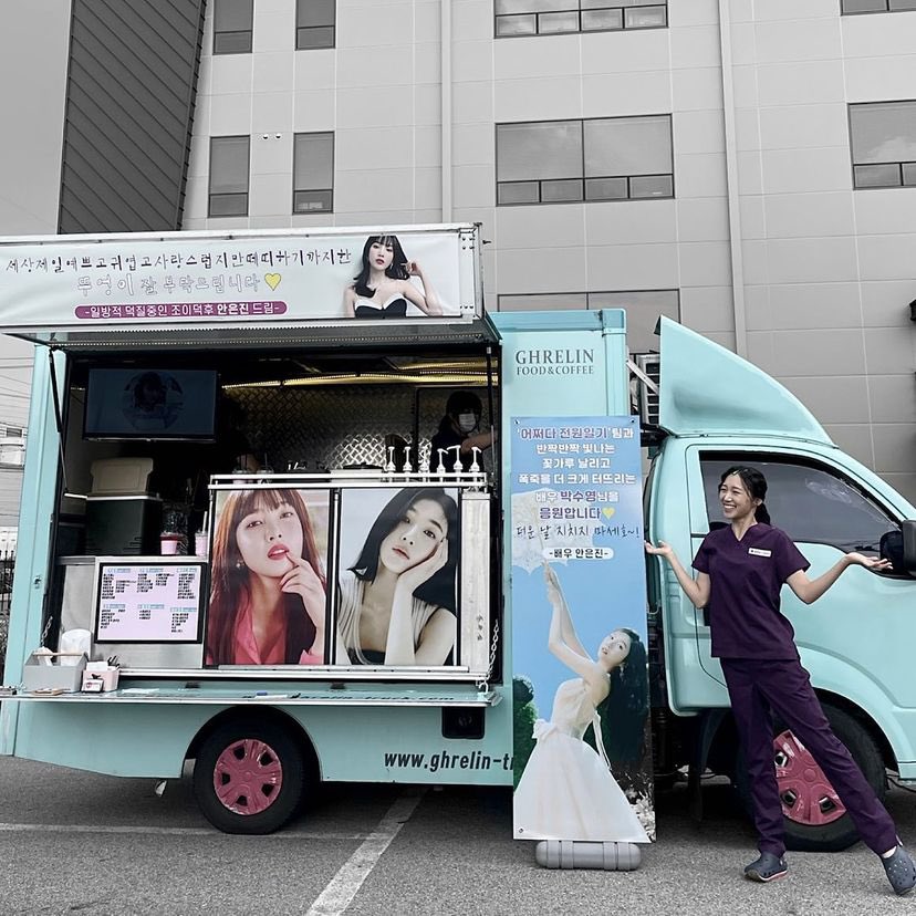 Actress Yeni Park updated her instagram with a picture of her in front of the support truck Actress Ahn Eunjin sent for Joy to the set of #OnceUponASmallTown 💚🫶