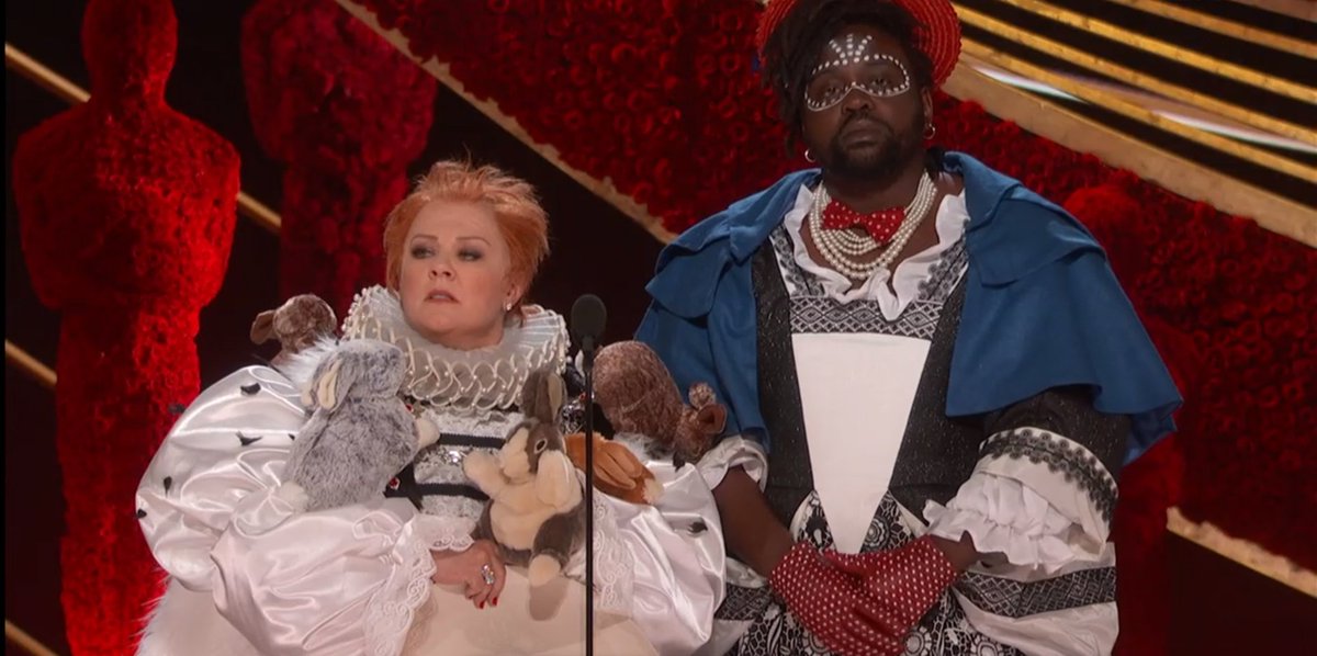 #アカデミー賞2019 衣装デザイン賞のプレゼンターになったのはメリッサ・マッカーシーとブライアン・タイリー・ヘンリー。『女王陛下のお気に入り』のパロ衣装で発表しようとしたところ、左手をうさちゃんにしているため、封筒が開けられないというハプニング発生。かわいい💛 #Oscars #Oscars2019